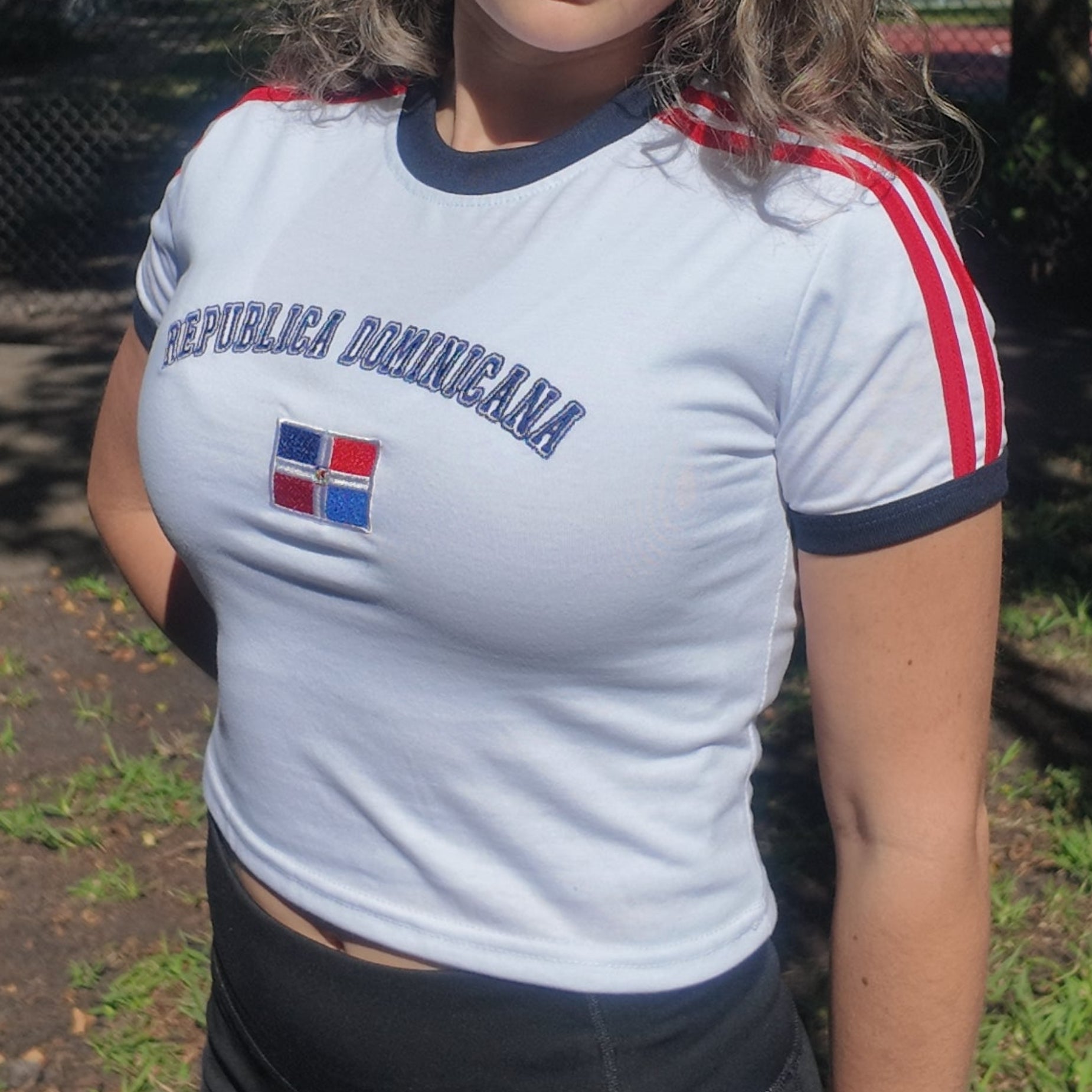 “Polera bordada modelo Baby Tee — Cómoda, coqueta y con todo el power RD ¡Perfecta para lucir tu orgullo con estilo!” Notas: Estas son medidas aproximadas 👚 Baby tee: Cubre un poco más que un crop top (a veces llega justo al borde del pantalón). polera clásica, pero más corta y ajustada. SE RECOMIENDA PEDIR UNA TALLA MAS