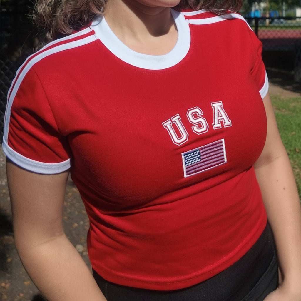 “Polera bordada modelo Baby Tee — Cómoda, coqueta y con todo el power US. ¡Perfecta para lucir tu orgullo con estilo!” Notas: Estas son medidas aproximadas 👚 Baby tee: Cubre un poco más que un crop top (a veces llega justo al borde del pantalón). polera clásica, pero más corta y ajustada. SE RECOMIENDA PEDIR UNA TALLA MAS